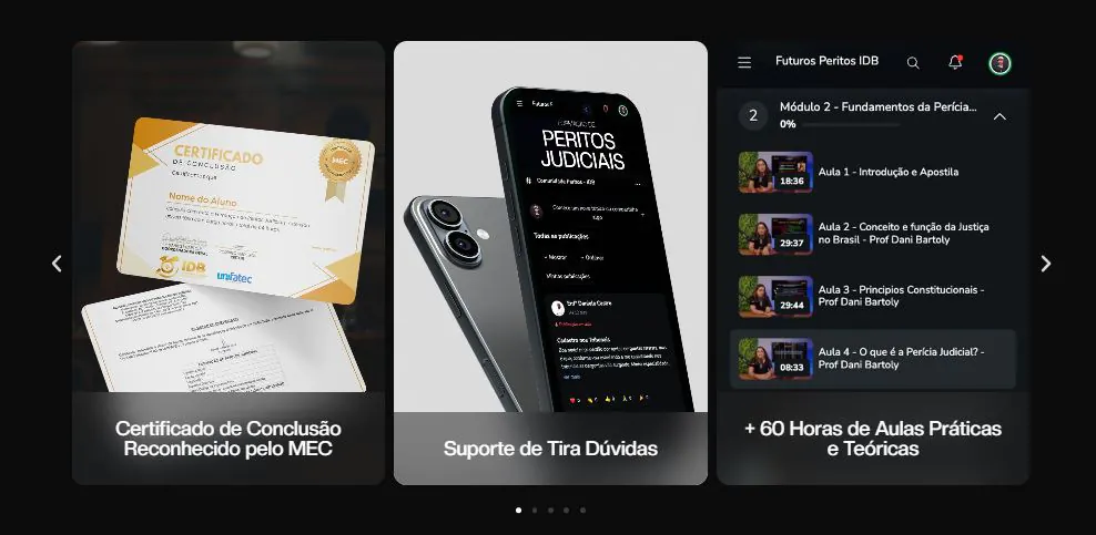 Outro ponto relevante é a confiabilidade do curso. A Formação de Peritos Judiciais IDB é estruturada de forma organizada, com metodologia clara e materiais didáticos voltados para a realidade do mercado. Isso transmite maior segurança ao aluno, principalmente para quem busca um curso sério, com proposta profissional e alinhada às exigências da atividade pericial.